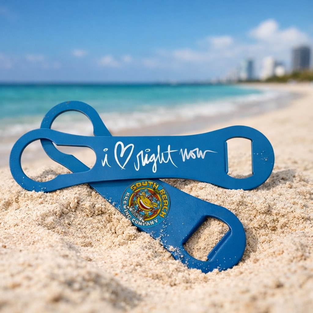 Blue steel bar key/ bottle opener featuring our main logo designed by David “LEBO” Lebatard for SBBC and our signature ‘I Love Right Now!’ catchphrase on the reverse.