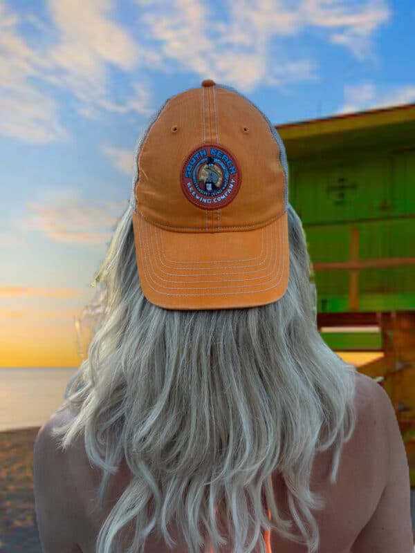 Two-Tone Ahead Sportswear caps with embroidered patches and a snap back – choice of three designs: pink/tan with SBBC main logo, blue/tan with SBBC main logo, and orange/tan with our signature Mimosa Brunch Beer logo.